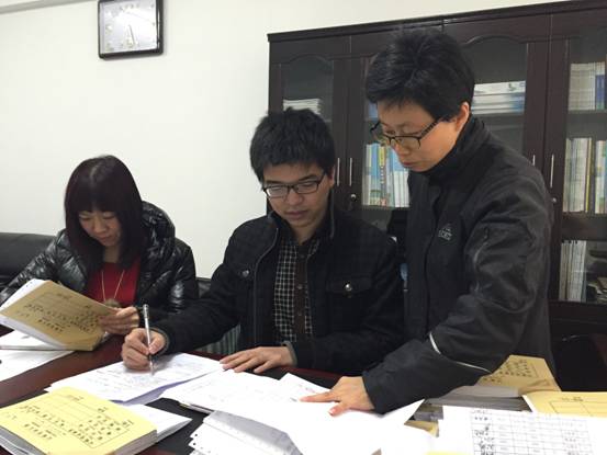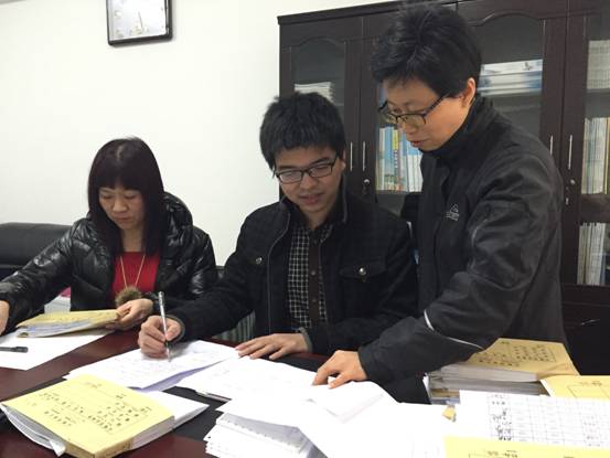 附图1、2为2月11第一检查组成员正在仔细查看万安社区服务中心2013年-2014年的财务账册
