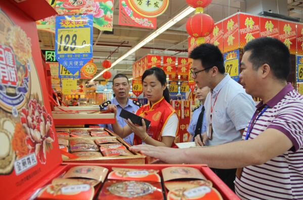 图二为督查组人员在向一商场内的导购人员了解月饼销售情况。