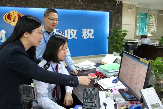 图二为3月28日,驻区财政局纪检监察组和区税务局纪检组工作人员在办税窗口查询纳税人减免税费情况