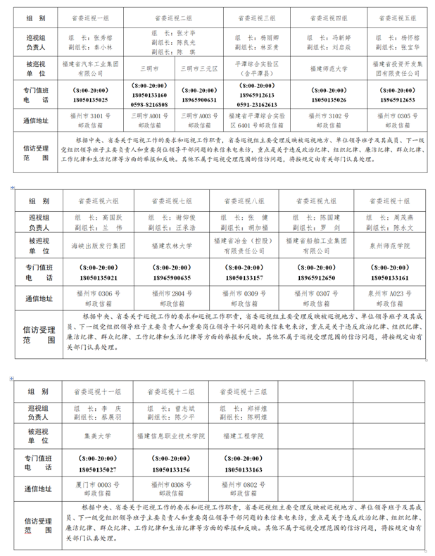 根据《中国共产党巡视工作条例》及中央、福建省委关于巡视工作的部署要求,经省委巡视工作领导小组同意,从5月上旬开始,省委巡视组对三明市、平潭综合实验区(含平潭县)、三明市三元区,福建师范大学、福建农林大学、集美大学、泉州师范学院、福建工程学院、福建信息职业技术学院、海峡出版发行集团、福建省投资开发集团有限责任公司、福建省船舶工业集团有限公司党委,福建省冶金(控股)有限责任公司、福建省汽车工业集团有限公司党组开展常规巡视。对设区市的巡视时间2个月左右,对省属高校、省属国有企业、县(市、区)巡视时间40天左右。日前,13个巡视组已进驻巡视。