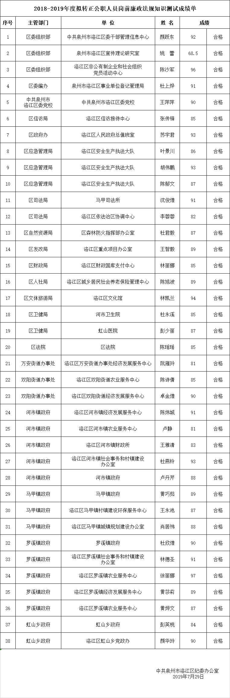 2018-2019年度拟转正公职人员岗前廉政法规知识测试成绩单