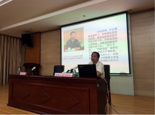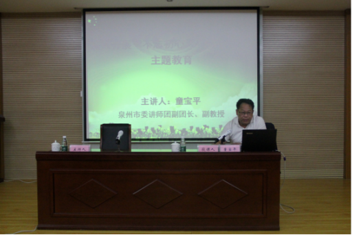 图二为泉州市委讲师团副团长童宝平正在为学员们作“深入开展‘不忘初心、牢记使命’主题教育”专题授课。