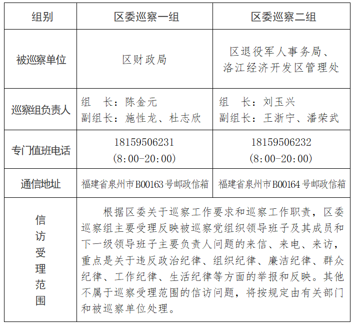 中共泉州市洛江区委第十轮第一批巡察公告
