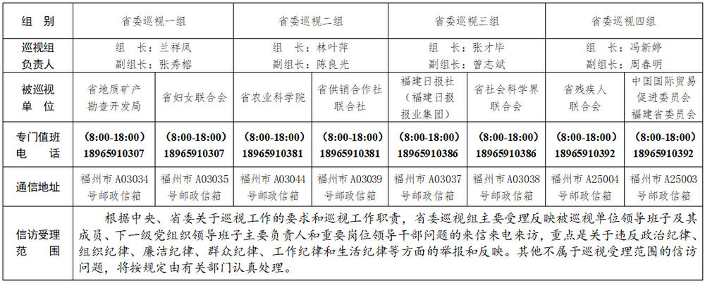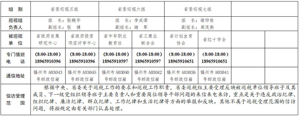 根据《中国共产党巡视工作条例》及中央、省委关于巡视工作的部署要求,经省委巡视工作领导小组同意,从7月上旬开始,省委巡视组对福建日报社(福建日报报业集团)、省政府发展研究中心、省农业科学院、省政府投资项目评审中心、省供销合作社联合社、省地质矿产勘查开发局、省妇女联合会、省社会科学界联合会、省计划生育协会、省残疾人联合会、中国国际贸易促进委员会福建省委员会、省中华职业教育社、省红十字会、省工商业联合会等14个省直单位党组织开展常规巡视。巡视时间30天左右。日前,7个巡视组已进驻巡视。