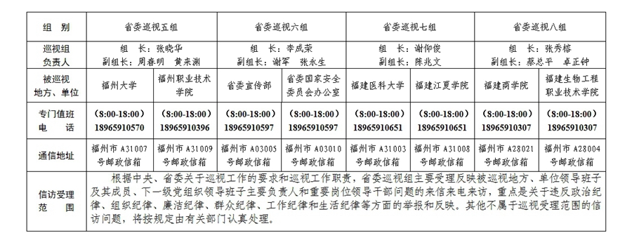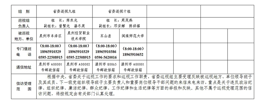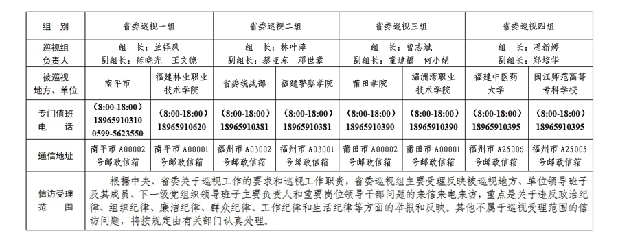 根据《中国共产党巡视工作条例》及中央、省委关于巡视工作的部署要求,经省委巡视工作领导小组同意,从10月中旬开始,省委巡视组对南平市、东山县、泉州市丰泽区;省委宣传部、省委统战部、省委国家安全委员会办公室;福州大学、福建医科大学、福建中医药大学、闽南师范大学、福建警察学院、福建江夏学院、莆田学院、福建商学院,福建林业职业技术学院、福建生物工程职业技术学院,福州职业技术学院、闽江师范高等专科学校、泉州经贸职业技术学院、湄洲湾职业技术学院等20个地方、单位党组织开展常规巡视。对设区市的巡视时间2个月左右,对其他地方、单位党组织的巡视时间30天左右。日前,10个巡视组已进驻巡视。