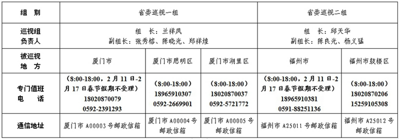 根据《中国共产党巡视工作条例》及中央、省委关于巡视工作的部署要求,经省委巡视工作领导小组同意,从1月上旬开始,省委巡视组对福州市、厦门市、福州市鼓楼区、厦门市思明区、厦门市湖里区等5个地方开展常规巡视。对设区市的巡视时间2个月左右,对其他地方的巡视时间30天左右。日前,2个巡视组已进驻巡视。