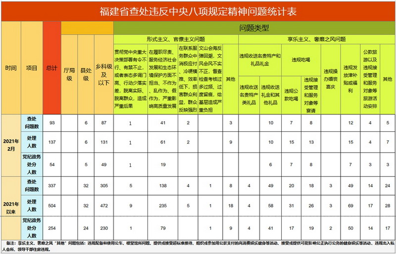 福建省通报2021年2月查处违反中央八项规定精神问题情况