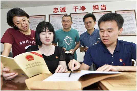 付玉凤(左二)结合实际案例,与同事交流讨论《政务处分法》有关条款的应用。