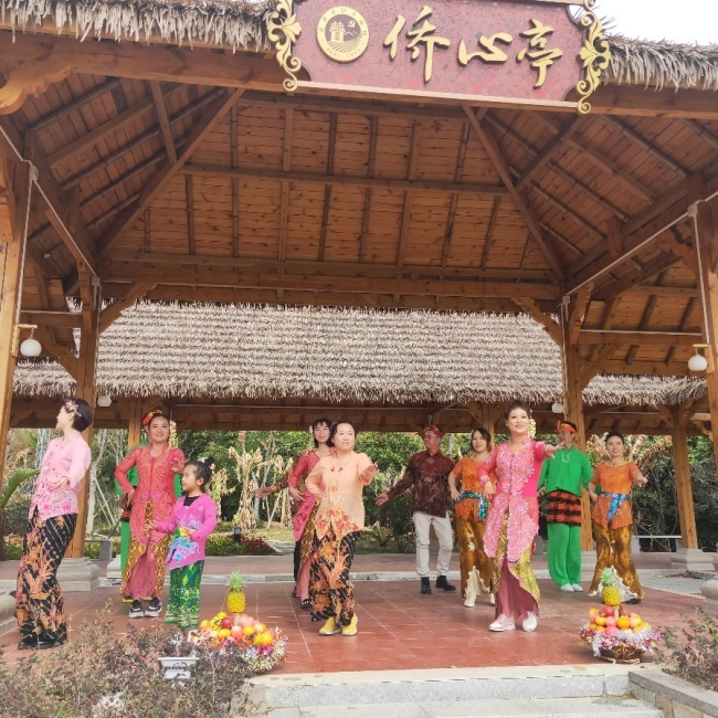 图二为双阳街道南山社区居民在峇厘民俗主题口袋公园内载歌载舞。
