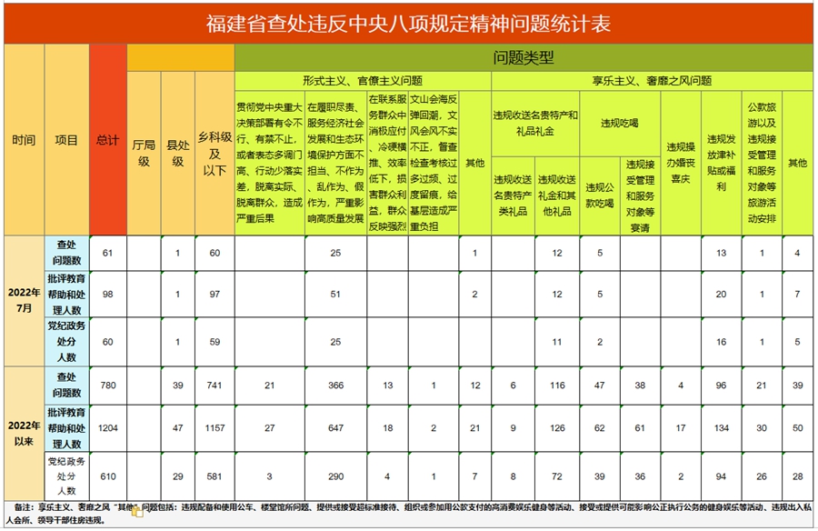 福建省通报2022年7月查处违反中央八项规定精神问题情况