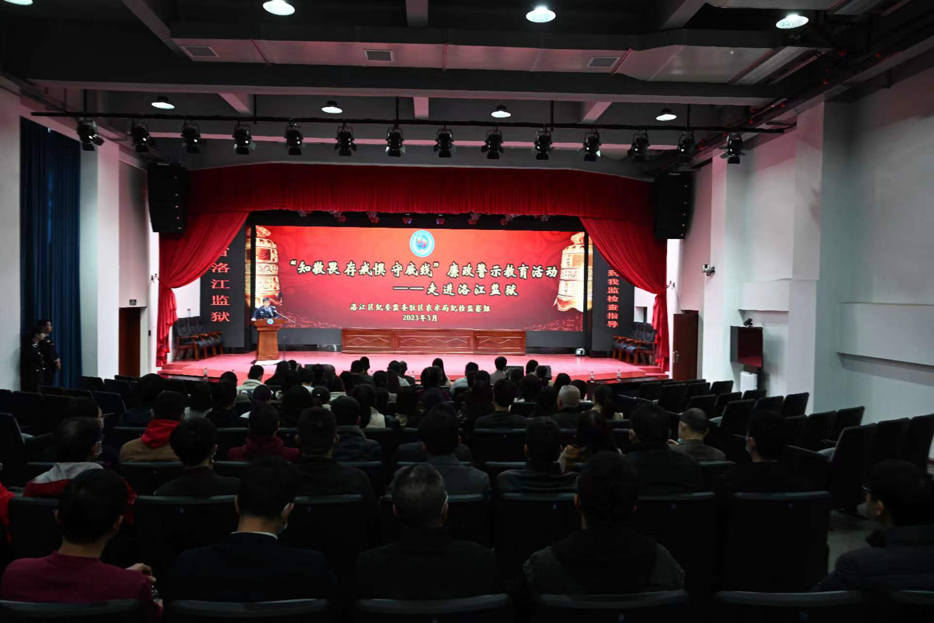 图为驻区农水局纪检监察组组织农水局、总工会等5个综合监督单位干部职工在洛江监狱参加警示教育的活动现场。
