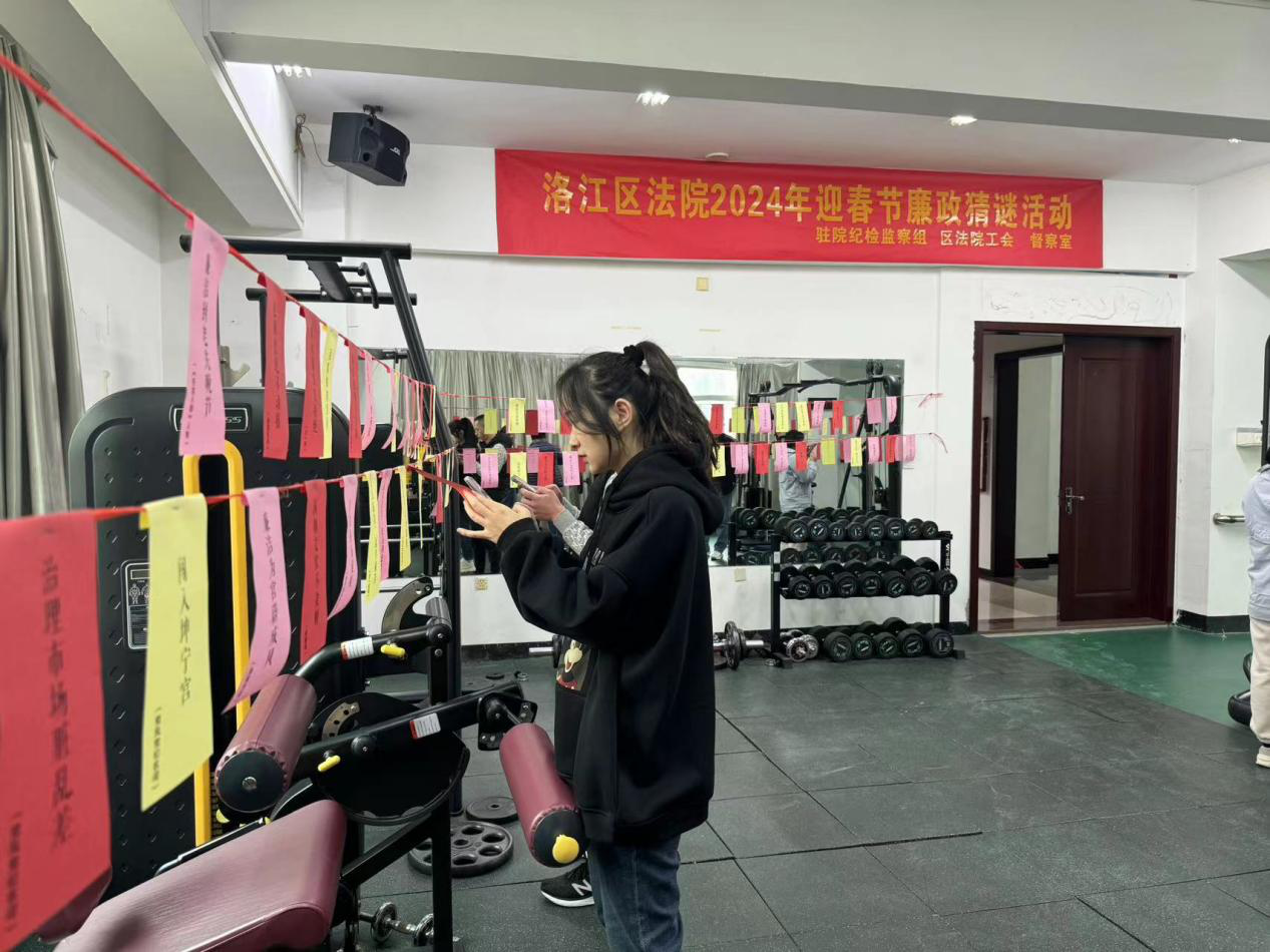 日前,驻区法院纪检监察组联合洛江区法院督查室举办“洛江区法院2024年迎春节廉政猜谜”活动暨“迎新春”趣味运动会,此次活动共制作200条谜语,内容融知识性、趣味性、教育性于一体,以干部喜闻乐见、趣味娱乐的形式营造了风清气正的节日氛围,加强全院干警党风廉政教育。广大干警在潜移默化中增强了廉洁自律的意识,进一步筑牢了拒腐防变思想道德防线。图为洛江区法院干警现场参与廉政猜谜活动。 (驻区法院纪检监察组)