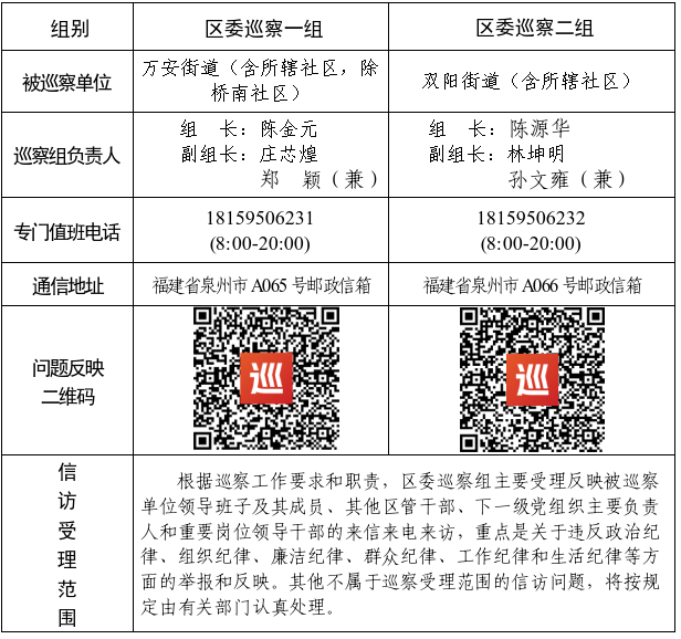 根据党中央关于巡视巡察决策部署及省委、市委、区委工作要求,经区委巡察工作领导小组研究决定,从2025年3月上旬开始,区委巡察组对万安街道、双阳街道开展常规巡察,同步派出联动巡察组对各街道所辖社区开展巡察,时间30个工作日左右。日前,巡察组已进驻巡察。